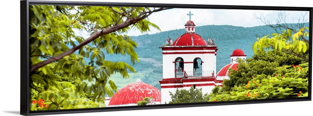 <p>Panoramic photograph of the top of a red and white church in Mexico. From the Viva Mexico Panoramic Collection.</p>