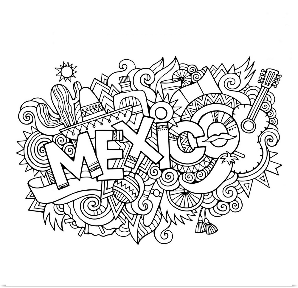 <p>An assortment of Mexican-themed items, including a sombrero and guitar, surrounding the word "Mexico."</p>