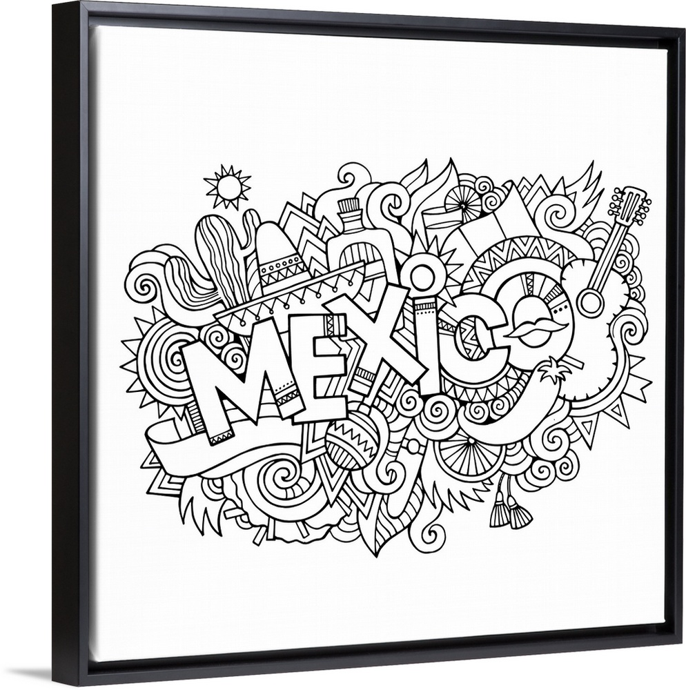 <p>An assortment of Mexican-themed items, including a sombrero and guitar, surrounding the word "Mexico."</p>