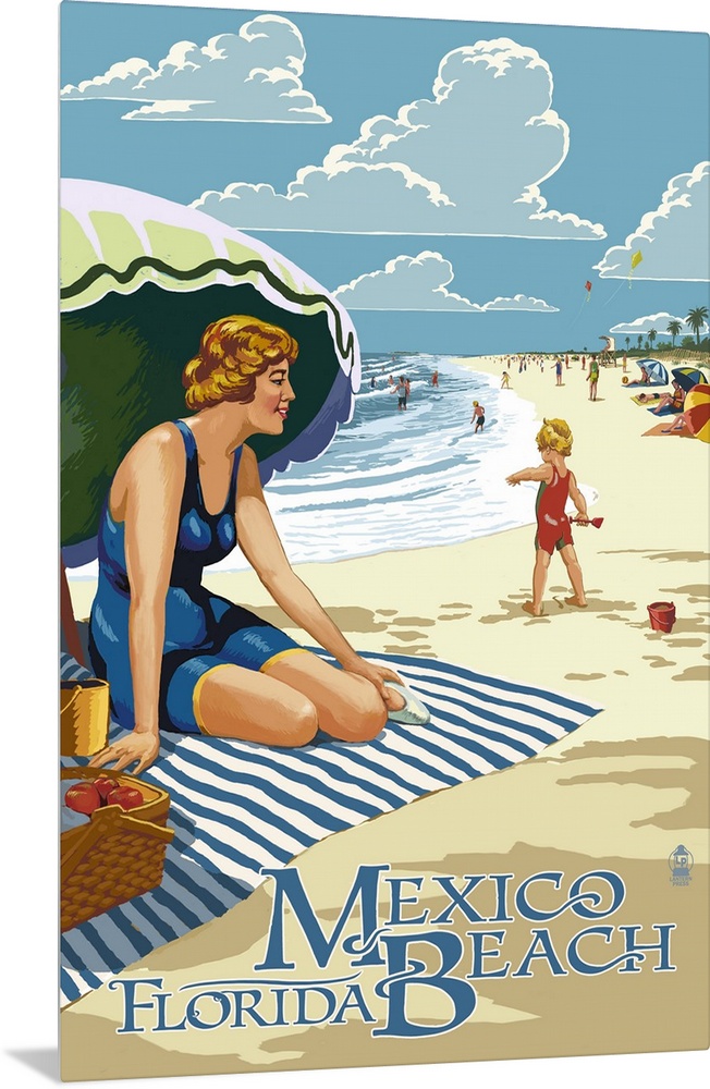 <p>Retro stylized art poster of a woman sitting on a beach towel under an umbrella with text underneath saying Mexico Beach, Florida.</p>