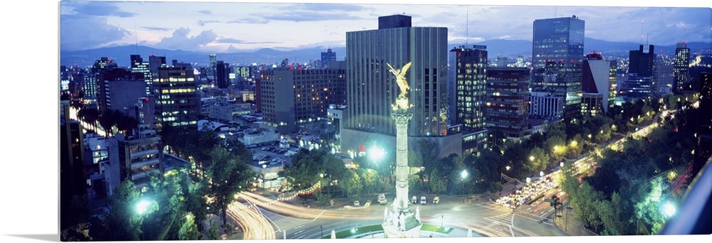 <p>Busy roundabout in a city in the evening with light trails from traffic circling the memorial pillar in the center, topped with a winged angel statue.</p>