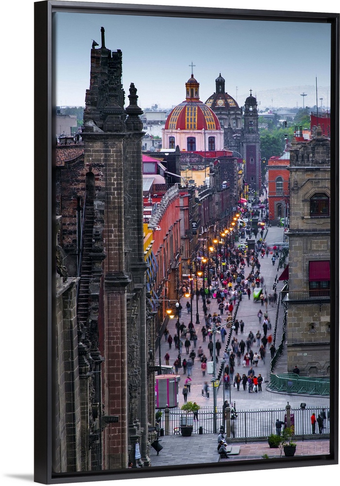 <p>Mexico, Mexico City, Emiliano Zapata Street, Pedestrian Way, Dusk, Centro Historico, Red Dome of Iglesia de la Santisima Trinidad.</p>