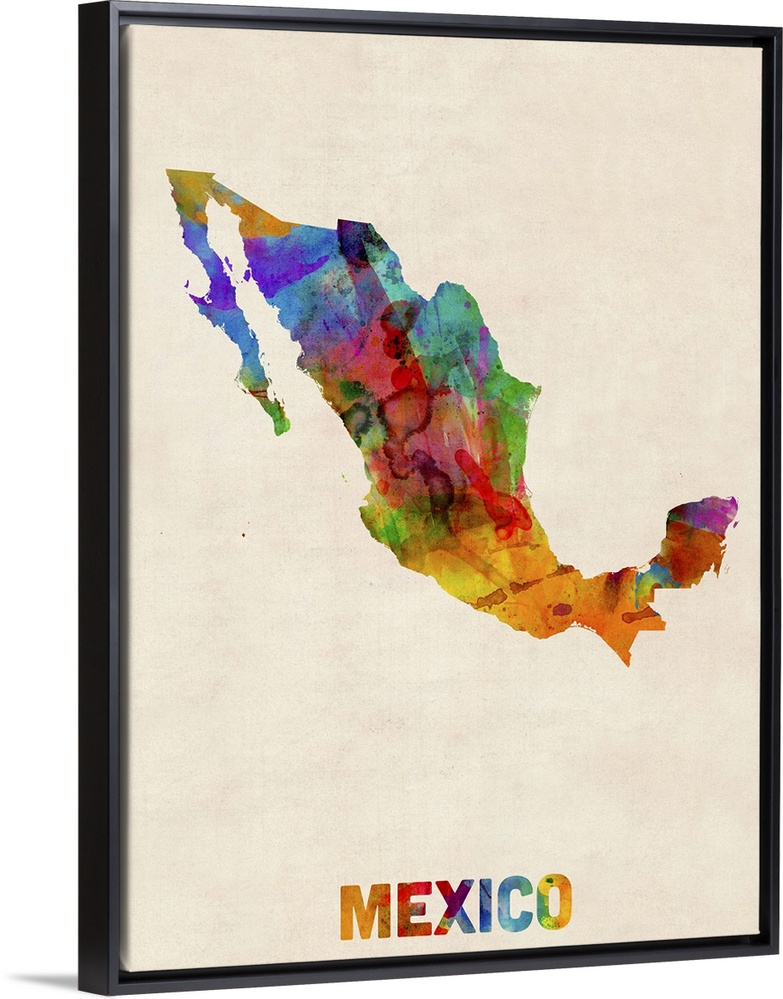 <p>Contemporary piece of artwork of a map of Mexico made up of watercolor splashes.</p>