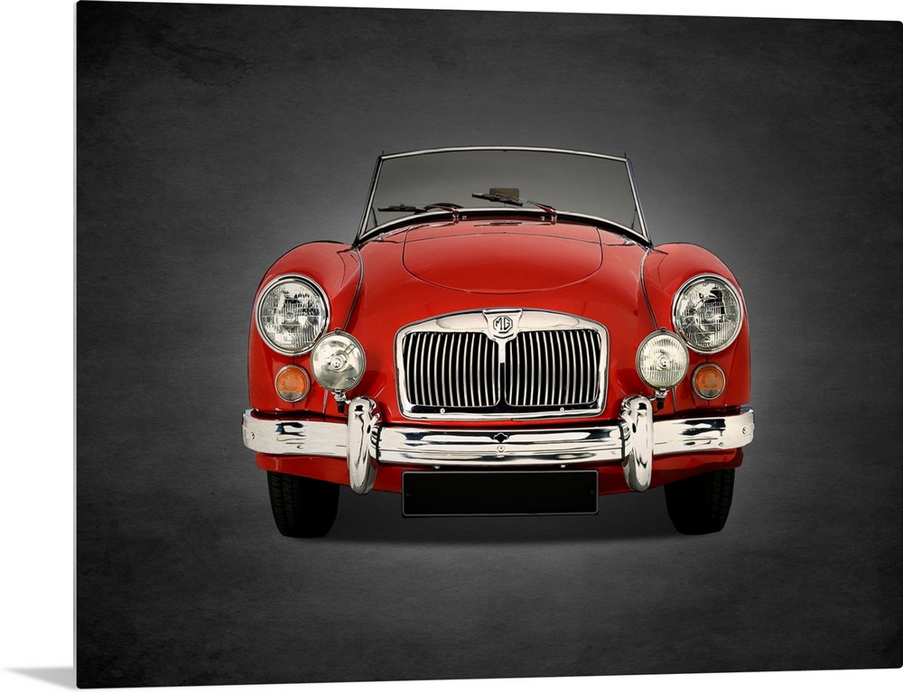 <p>Photograph of a red 1955 MG A 1500 printed on a black background with a dark vignette.</p>