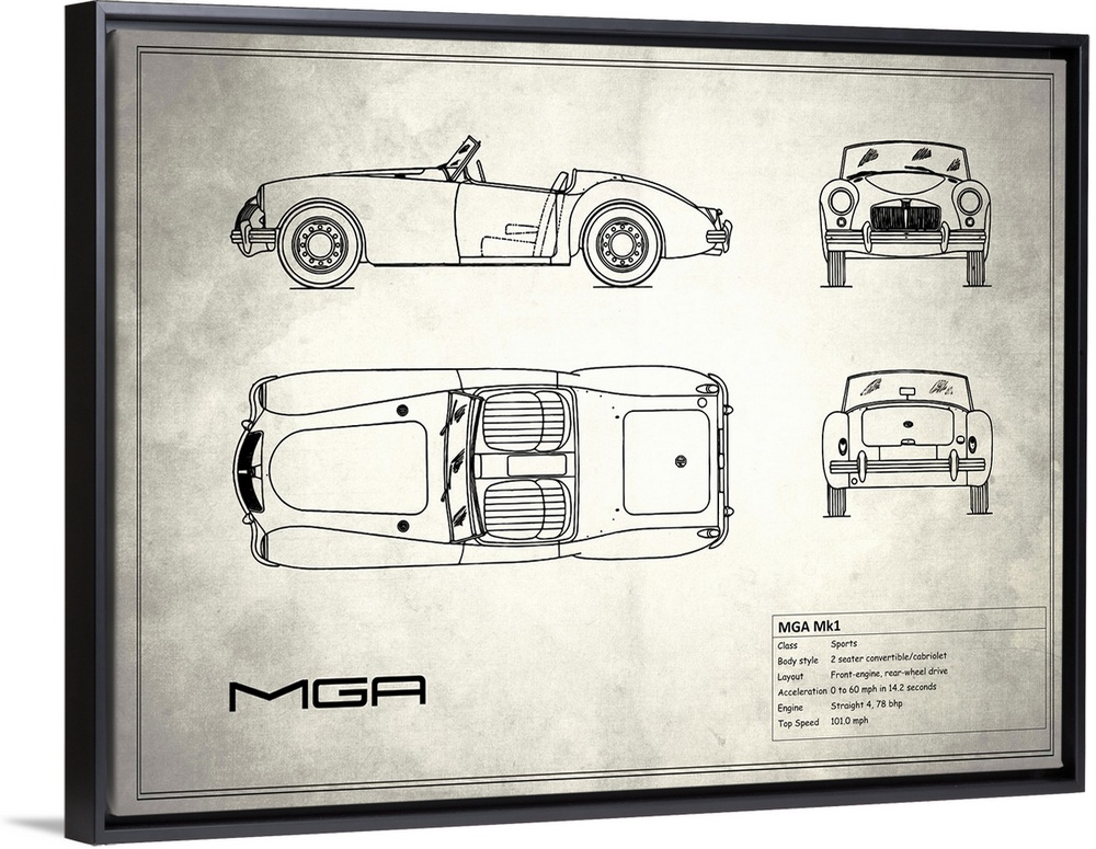 <p>Antique style blueprint diagram of a MG MGA printed on a weathered white and gray background.</p>