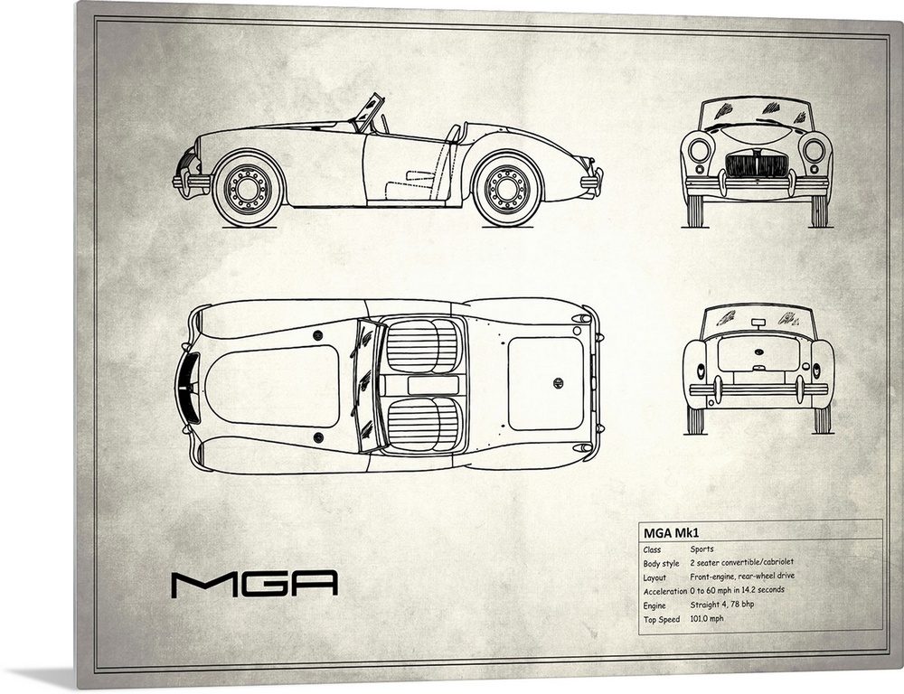 <p>Antique style blueprint diagram of a MG MGA printed on a weathered white and gray background.</p>