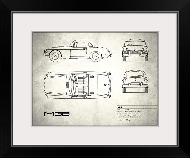 <p>Antique style blueprint diagram of a MG MGB printed on a weathered white and gray background.</p>