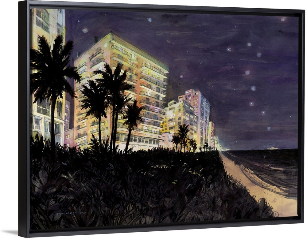 <p>Middle Beach, Miami at night. All the lights are on but is anybody home? Originally painted in watercolor, ink, colored pencil, and acrylic on toned paper.</p>