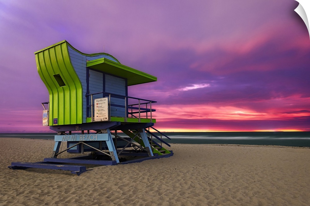 <p>Sunrise paints storm clouds over Miami Beach's retro 18th Street lifeguard station.</p>