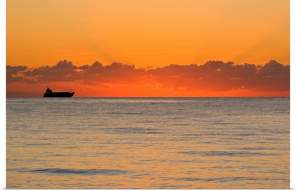 <p>A silhouetted ship moments before the sun rises over the horizon.</p>