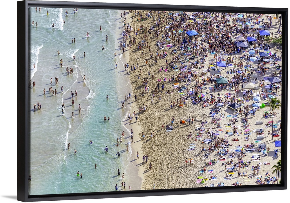 <p>Aerial view of hundreds of beachgoers in the sand and turquoise waters of Miami Beach in Florida.</p>