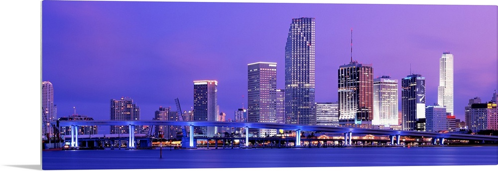 <p>Wide angle photograph of brightly lit bridge and skyscrapers of the Miami skyline at sunset.</p>