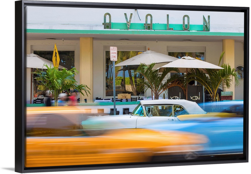 <p>U. S. A, Miami, Miami Beach, South Beach, Ocean Drive, Traffic passing Yellow and white vintage car parked outside Avalon Hotel.</p>