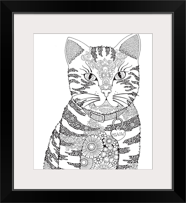 <p>Black and white line art of an intricately designed cat with a floral print body and a name tag that reads "Miaow"</p>