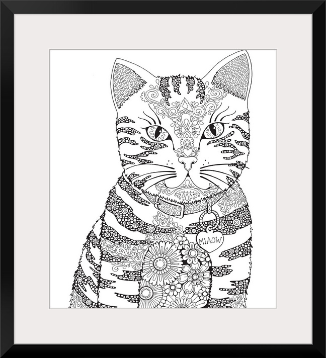 <p>Black and white line art of an intricately designed cat with a floral print body and a name tag that reads "Miaow"</p>