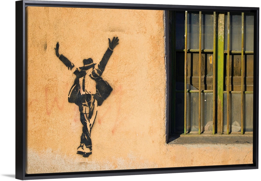 <p>Michael Jackson stenciled on a wall near a window.</p>