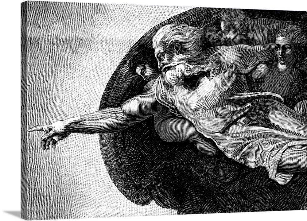 <p>Michelangelo's 'Creation of Adam'. 1864 illustration of God in the Heavens from Michelangelo's painting entitled 'The Creation of Adam'. The original painting adorns the ceiling of the Sistine Chapel in the Vatican City.</p>