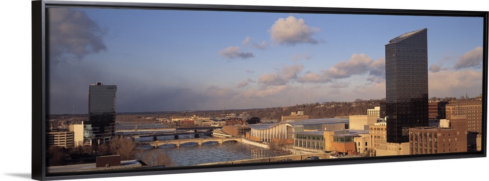 <p>The city skyline in Grand Rapids is photographed in panoramic view with a river cutting in between some of the buildings.</p>