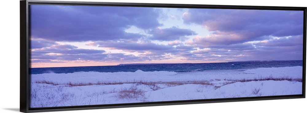 <p>Large, wide angle photograph of a beach off of Lake Michigan, under a sky of pastels and clouds at sunset.</p>