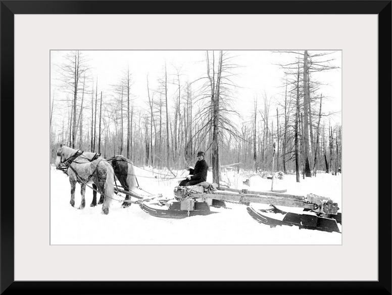 <p>Michigan, Lumbering. A Lumberjack Logging With Horsedrawn Sled During the Winter In Michigan. Photograph, c1880-1899.</p>