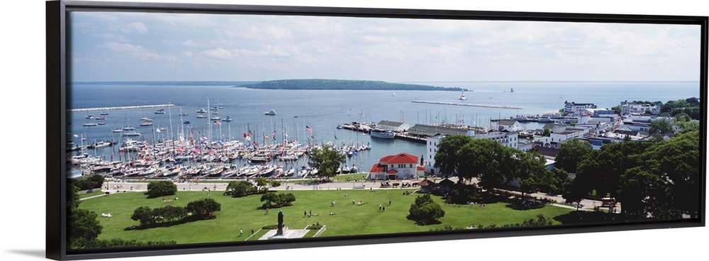 <p>Wide angle photograph is taken of a body of water that has several boats docked in it along the coast. A small island is seen in the distance.</p>
