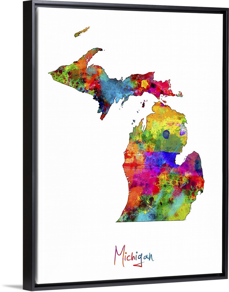 <p>Contemporary artwork of a map of Michigan made of colorful paint splashes.</p>