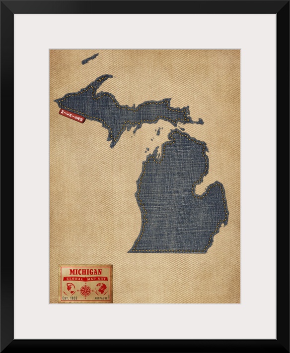 <p>Contemporary artwork of the state of Michigan made of denim, against a rustic background.</p>