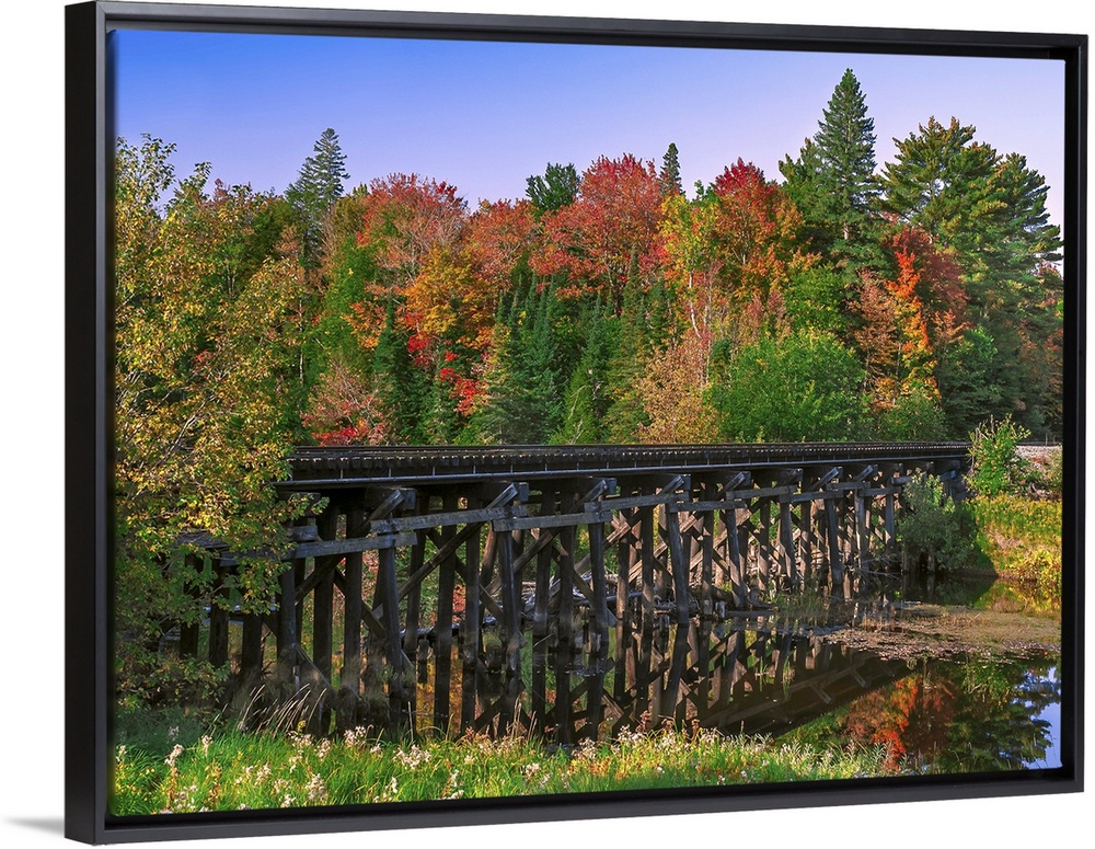 <p>A wooden trestle railroad bridge over a river in a Michigan forest, with trees changing to fall colors.</p>