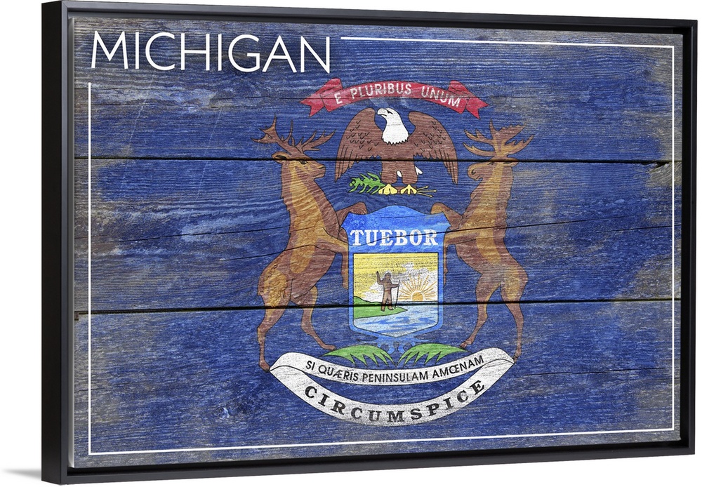 <p>The flag of Michigan with a weathered wooden board effect.</p>