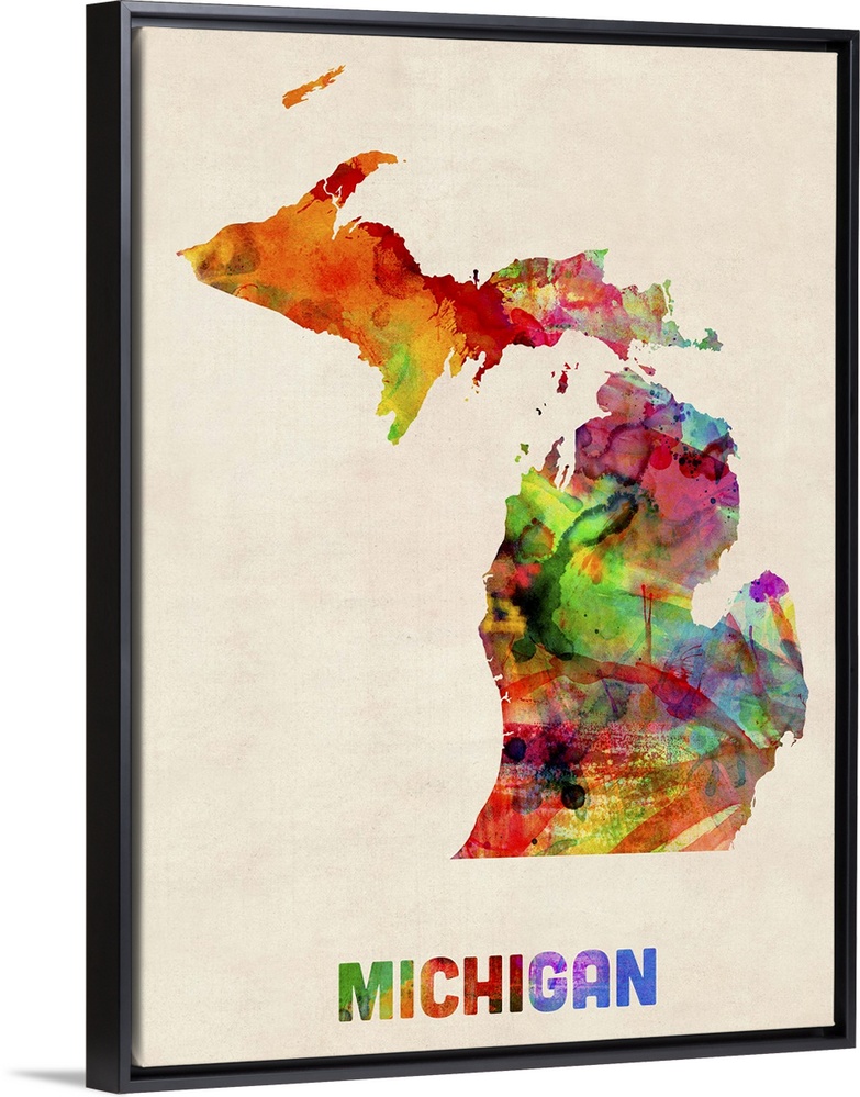 <p>Contemporary piece of artwork of a map of Michigan made up of watercolor splashes.</p>