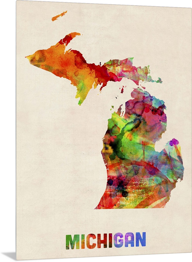 <p>Contemporary piece of artwork of a map of Michigan made up of watercolor splashes.</p>