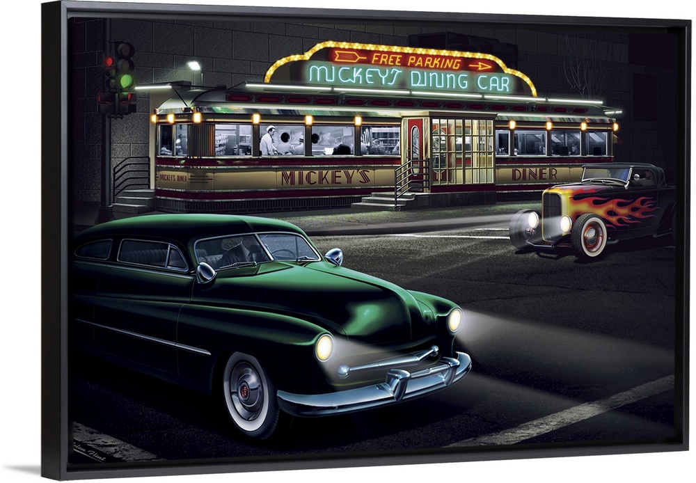 <p>Digital art painting of Mickey's Diner with racing hot rods by Helen Flint.</p>