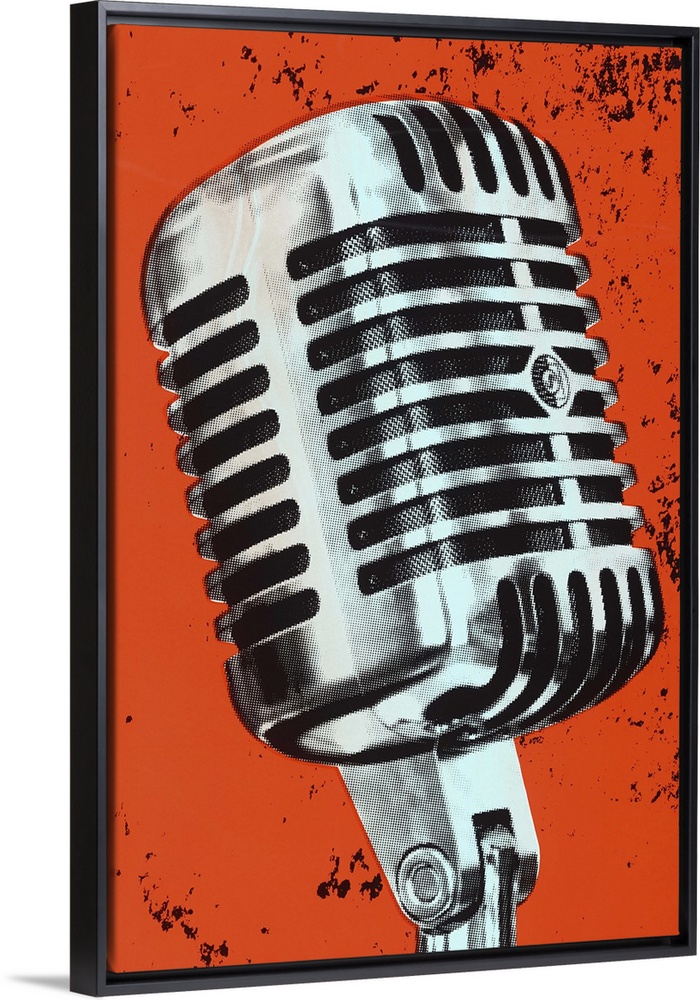 <p>Contemporary pop art style artwork of a microphone against a dark orange background.</p>