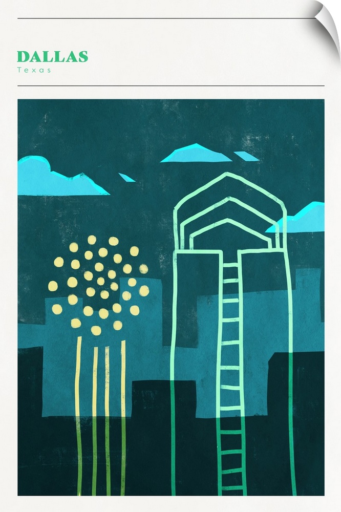 <p>Vertical modern illustration of the the city skyline of Dallas, Texas in shades of blue and green.</p>