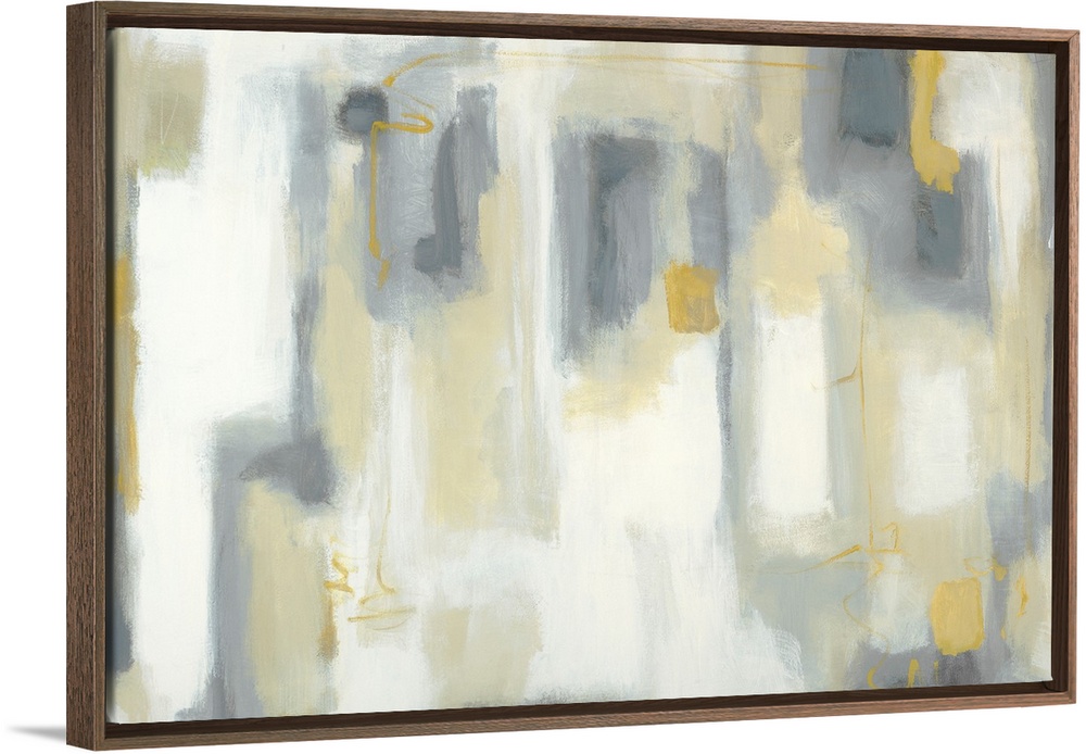 <p>Abstract painting of soft vertical rectangles in shades of yellow, gray and white.</p>