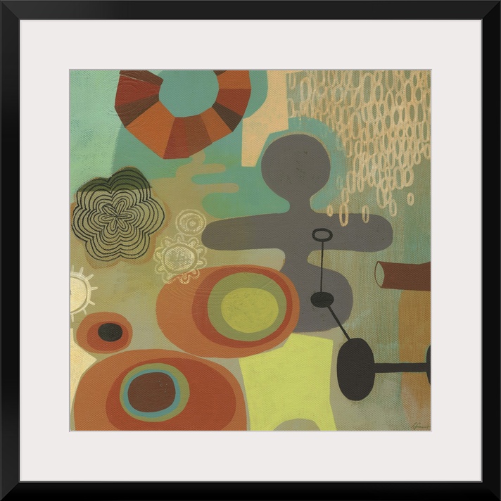 <p>Contemporary painting with a retro feel of colorful shapes and patterns.</p>