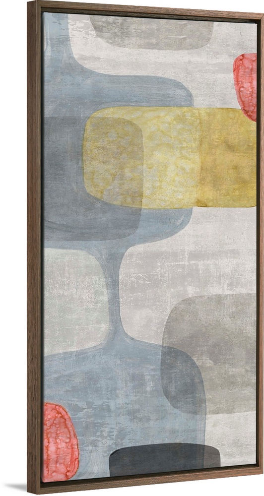 <p>Abstract panel painting with retro design in blue, gray, yellow, and red hues.</p>
