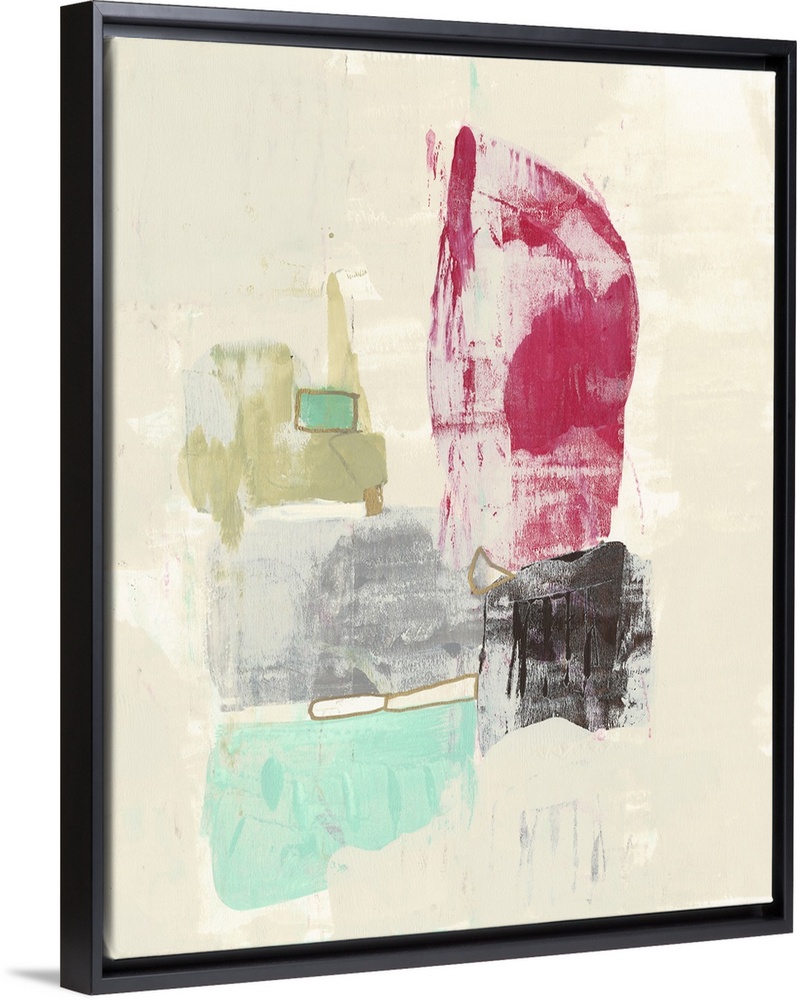 <p>Contemporary abstract painting in olive, bright raspberry, and teal on a neutral background.</p>