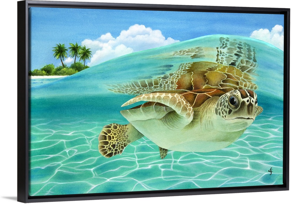 <p>Watercolor painting of a sea turtle under a crystal blue wave with an island in the background.</p>