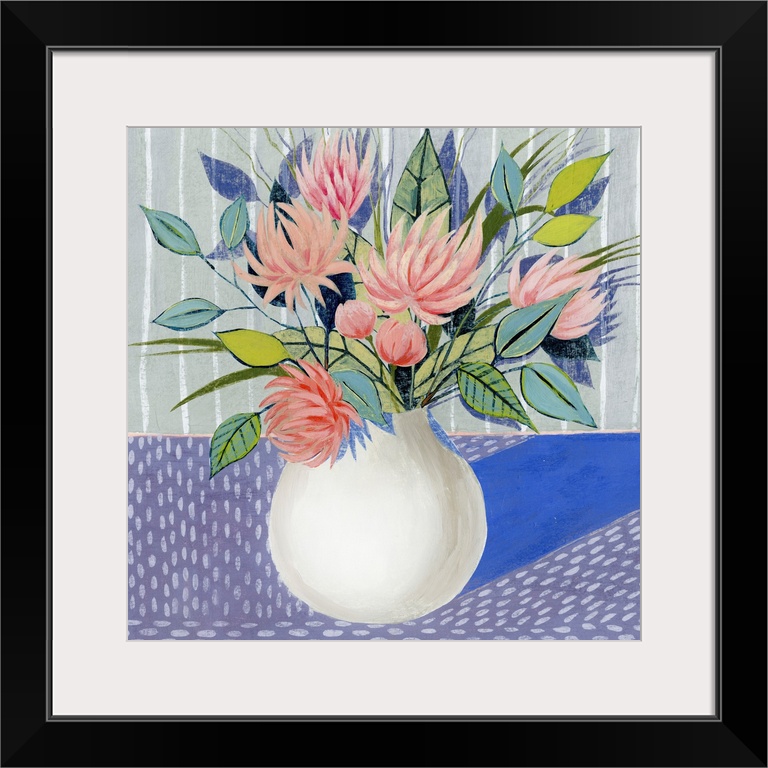 <p>Mod artwork of pink flowers blooming in a white round vase.</p>
