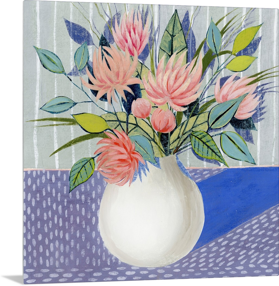 <p>Mod artwork of pink flowers blooming in a white round vase.</p>