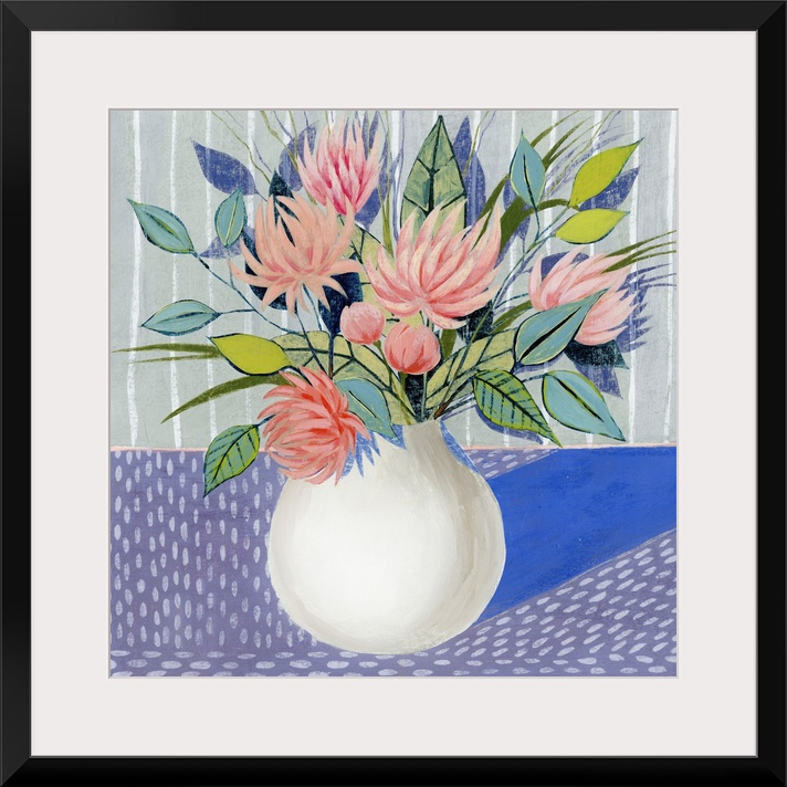 <p>Mod artwork of pink flowers blooming in a white round vase.</p>
