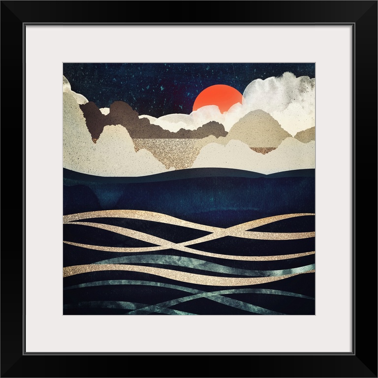 <p>Abstract depiction of beach at midnight with hills, waves, gold, blue and orange.</p>