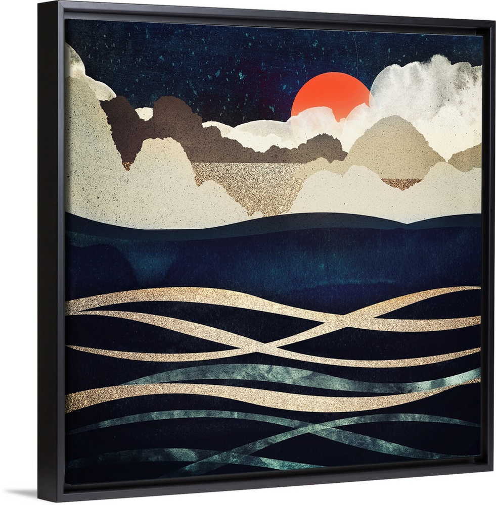 <p>Abstract depiction of beach at midnight with hills, waves, gold, blue and orange.</p>