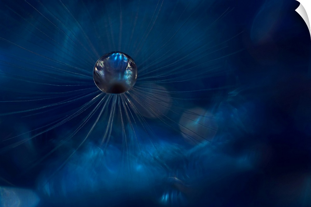 <p>Macro photograph of a water drop on a dandelion seed with a deep blue background and a shallow depth of field.</p>