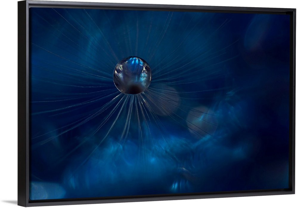 <p>Macro photograph of a water drop on a dandelion seed with a deep blue background and a shallow depth of field.</p>