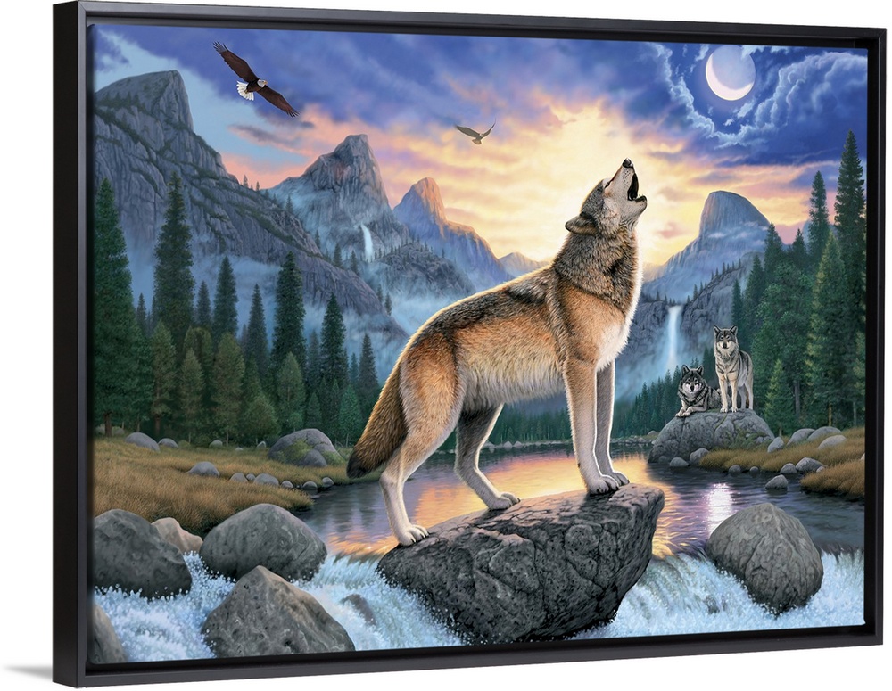 <p>Fantasy style artwork of a wolf standing on a rock in a rapid howling at the moon that is peaking out from the clouds.</p>