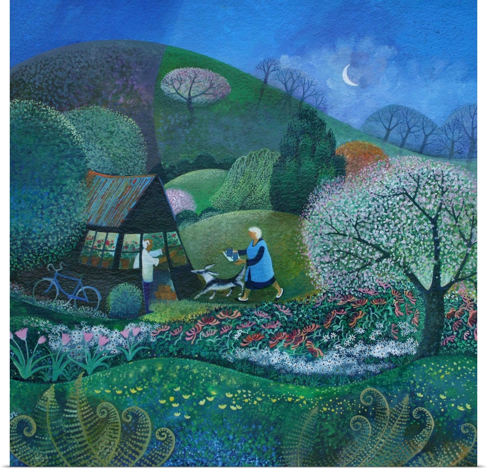 <p>Contemporary painting of a person walking in a garden in the evening.</p>