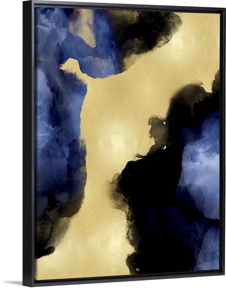 <p>Abstract painting with indigo hues splattered together on a gold background.</p>