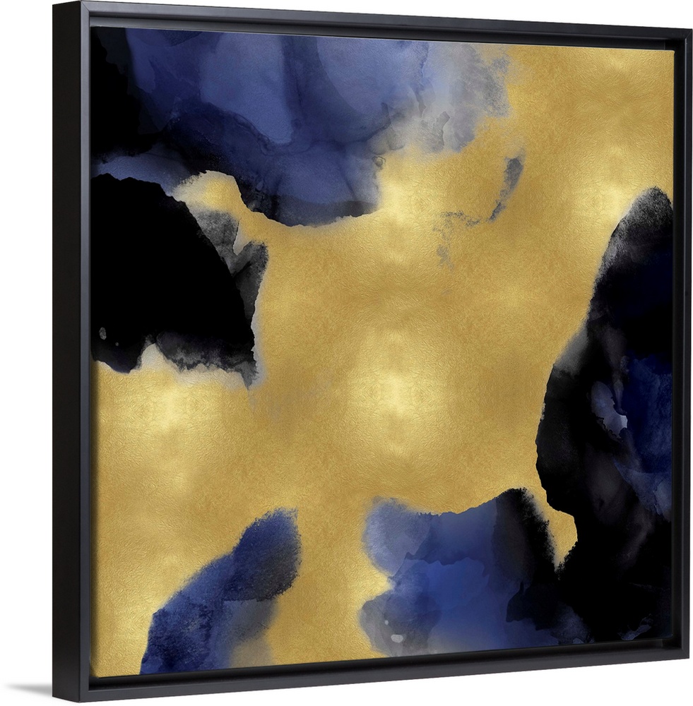 <p>Abstract painting with indigo hues splattered together on a gold background.</p>